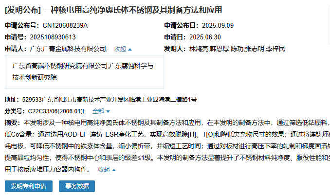 廣青科技聯(lián)合多家企業(yè)成功申請一項名為“一種核電用高純凈奧氏體不銹鋼及其制備方法和應用”專利